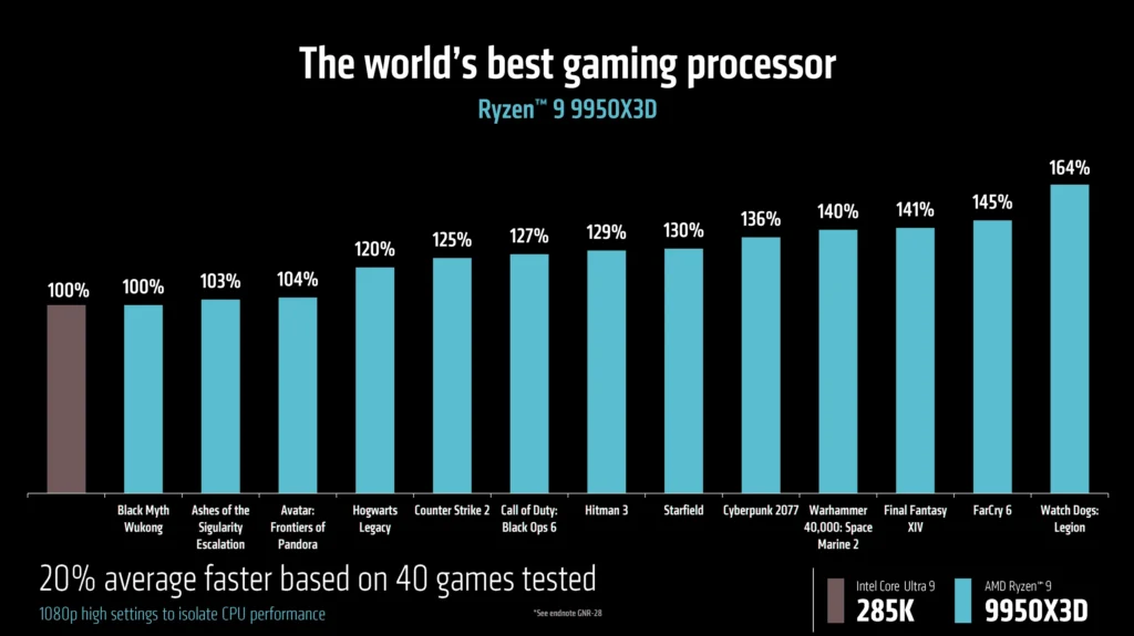 Gaming: The 9950X3D is 8% faster than the 7950X3D and 20% faster than Intel’s Core Ultra 9 285K in 1080p gaming.